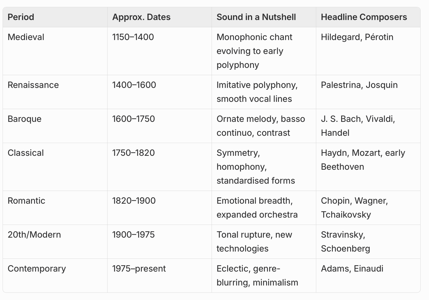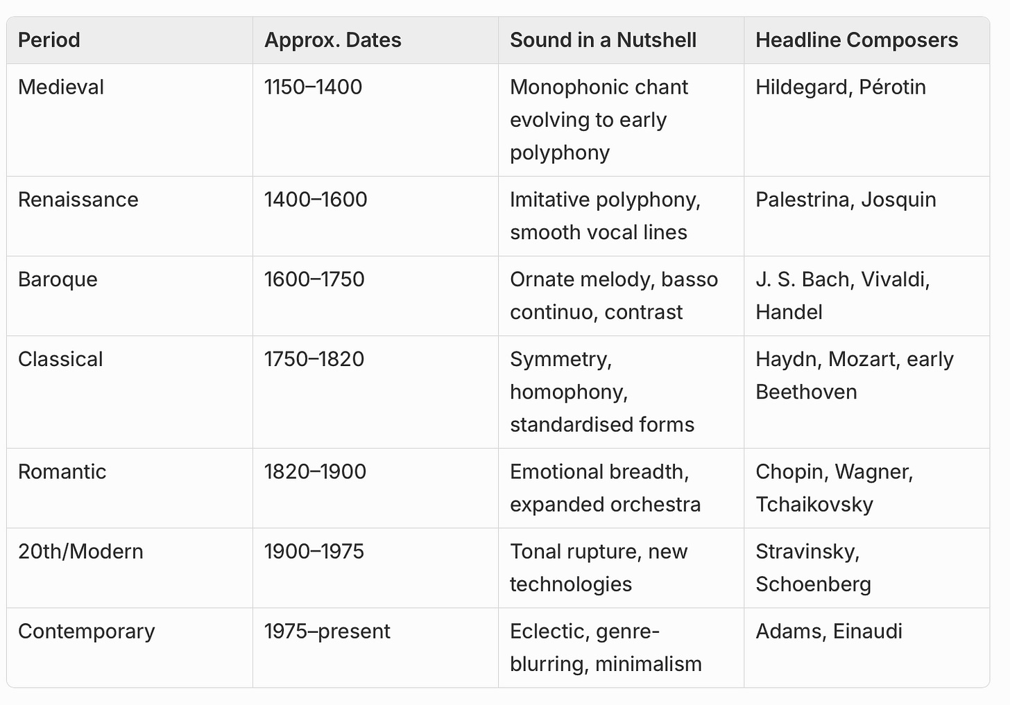 Western art music unfolds like a relay race, each period handing ideas to the next. The baton starts in the Medieval monasteries, gathers polyphonic momentum in the Renaissance, blossoms into Baroque ornamentation, straightens into Classical balance, swells with Romantic passion, fragments in the 20th-century search for new sounds and keeps morphing today.